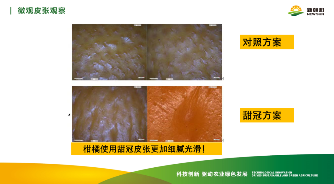 甜冠(冠菌素)適用于各類柑橘品種,如愛媛、金秋砂糖橘、砂糖橘、冰糖橙、金桔、沃柑、耙耙柑、不知火等。促進(jìn)果實(shí)轉(zhuǎn)色、顏色紅潤,表皮靚麗,提升干物質(zhì)積累,如提升糖度、芳香味物質(zhì)積累,提高果實(shí)品質(zhì),提前上市,提升抗逆性,延長果實(shí)留樹保鮮和果實(shí)貨架期,減少流通環(huán)節(jié)損耗。